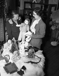 Mrs. A. Antweil of 1919 Forest Park Boulevard, left, volunteer worker at the Lighthouse for the Blind, 428 South Lake, displays some of the numerous gifts on sale there at the annual bazaar. In the picture you can see Mrs. Antweil wearing a dress and she has a rag doll in her hand. Mrs. bell is wearing a plaid skirt suit and she has a lamb stuffed animal and in the table there are a couple of toys within the Christmas decoration. In the background of the picture you can see a shelf with other items and a broom rack next to it.