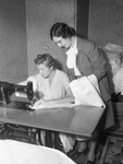 Lighthouse for the Blind. Mrs. Frances Aycock (sewing with treadle sewing machine) and Mrs. Edith Bell (standing). Mrs. Aycock is wearing a white dress the sewing machine is singer. Mrs. Bell is wearing a plaid skirt suit, eyeglasses, and has a piece of cloth in her hands.