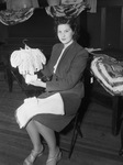 Lighthouse for the Blind. Mrs. Wilburn Worlow examining items to be sold. She is holding a crocheted baby jacket with a baby blanket and booties on her lap. Other crocheted items are on tables and a piano behind her. She appears to be wearing a skirt suit.