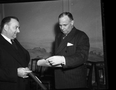 Fort Worth, Texas Mayor T. J. Harrell, right, is attending the Rotary Club luncheon at the Hotel Texas. Upon arrival, he received a surprise package from Winthrop P. Younger, left. Mr. Younger is an assistant general manager of the National Affiliated Hotels. He is giving the mayor an invitation to be an honor guest at the Mardi Gras in Galveston, Texas. Mr. Younger is dressed in a three piece suit. Mayor Harrell is wearing a double breasted suit.