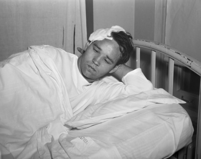 John Gaston, 20, night attendant at a service station, who was beaten by two robbers. He is shown in a hospital bed at Harris Memorial Methodist Hospital. His head is partially bandaged.