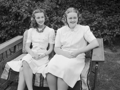 Miss Mary Elizabeth Thompson of Waterville, Kansas, left, and her hostess, Miss Margaret Lowdon, daughter of Mr. and Mrs. W. C. Lowdon. The two girls were classmates at Monticello College in Gofrey, Illinois. They are both wearing dresses and sitting on a bench outside. Miss Lowdon is wearing eyeglasses.