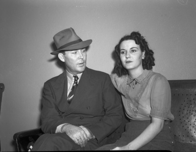 Two of the 28 defendants in the "Green Dragon" narcotic case for which preliminary hearing was held June 28, 1940, in United States District Court in Fort Worth, Texas. The defendants are Mr. and Mrs. Dewey Ross. They are shown sitting on a bench. Mr. Ross is wearing a double-breasted suit and a hat. Mrs. Ross is wearing a blouse, skirt and earrings.