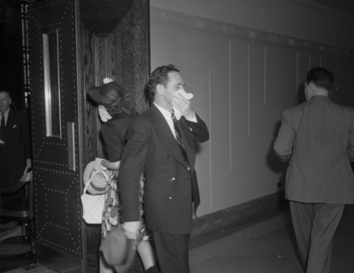 Phil Chadwick, center, is charged in the "Green Dragon" narcotic case, trial of which starts July 1, 1940, in Federal District Court. Chadwick is accused as head of the Green Dragon narcotic syndicate. He is alleged by the government to have been the Southwest representative of the nationwide drug smuggling syndicate. He is shown wearing a suit and partially covering his face with a handkerchief.