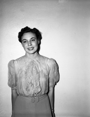 Mrs. John N. King, the former Miss Mary Erwin, of Shreveport, Louisiana. She is standing against a blank wall, wearing a blouse with lace and ruffle details and a skirt. She is smiling.