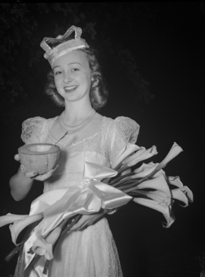 Charlotte Allison, queen of the sixth annual Grapevine Cantaloupe Festival. She is wearing a dress, three-strand pearl necklace and a crown. She is holding half a cantaloupe in her right hand and a bouquet of calla lilies in her left arm.
