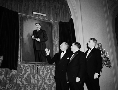 The portrait of Clyde O. Eastus is being unveiled Friday night at a dinner in Dallas, honoring Mr. Eastus. The portrait was painted by Seymour Stone, a New York artist. Pointing to the painting are left to right Maury Hughes, Mr. Eastus, and Mark McGee. Mr. Hughes, a Dallas attorney, is dressed in a double breasted tuxedo. Mr. Eastus, is a United States attorney for Northern District of Texas. He famously worked on bringing in Bonnie and Clyde. He is dressed in a tuxedo. Mr. McGee, Fort Worth attorney, is wearing a tuxedo.