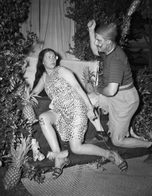 The Fort Worth Boat Club hosted a "Shipwreck Party," to entertain visitors from the Houston Yacht Club, in which partygoers dressed as shipwreck victims. Among those at the event were Mr. and Mrs. Charles T. Renaud. Mr. Renaud is wearing a pirate costume consisting of a striped t-shirt, shorts and a head wrap. He is holding a prop dagger in his right hand. Mrs. Renaud is dressed as his "captive." She is wearing a leopard print dress.
