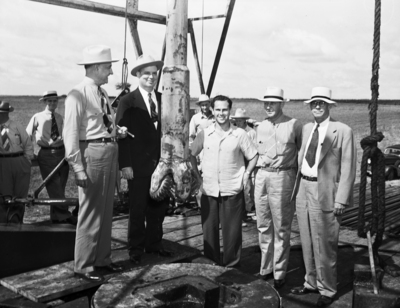 Standing in front of an oil derrick, left to right: Amon Giles Carter, John Naylor, Amon Gary Carter, derrick superintendent Ted Wilson and drilling contractor W. L. Todd.