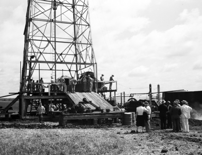 Several Fort Worth, Texas, residents were present at the spudding of the Amon Carter No. 1 Allen oil well. The photograph shows the oil well, with several people standing on its lower platform and on the ground in front of the well.