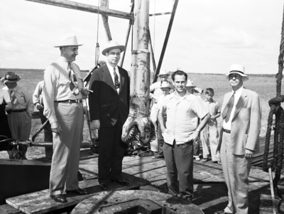 Several Fort Worth, Texas residents were present at the spudding of the Amon Carter No. 1 Allen oil well. The photograph shows Amon Carter, Sr. (left) and three unidentified men standing near the drill before it enters the ground to spud the oil well.