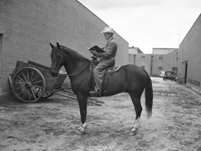 Ward Bailey on horseback. He is wearing a suit, eyeglasses and a cowboy hat and is holding an open file. In the background are a wagon and an automobile.