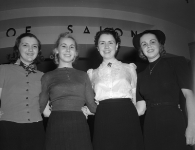 The Texas Oklahoma Shoe Retailers Association is holding a convention at the Hotel Texas. More than 240 lines are being shown. Modeling some of the new styles left to right are Mrs. Jeff South Junior, Miss Elsa Cashion, Miss Nell Allen, and Miss Peggy Newton. Mrs. South is dressed in a button-up blouse, scarf, and skirt. She will model beige alligator ghillies. Miss Cashion is dressed in a sweater and a pleated skirt. She will model toeless pumps. Miss Allen is wearing a pleated blouse with a brooch and a skirt. She will model cowgirl boots. Miss Newton is dressed in a hat, blouse, skirt, and a cross necklace. She will model a pair of high heeled wedges.