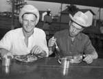 Attending the Texas Cowboy Reunion at Stamford, Texas, were John H. Owens, left, and Walter Leonard, of the Pitchfork Ranch near Guthrie, Texas. They are sitting at a picnic table, eating. Both men are wearing collared shirts and straw hats.