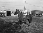 A. C. Cooper, vice president of the Texas Cowboy Reunion Association, riding a horse at the Texas Cowboy Reunion at Stamford, Texas. He is wearing a short-sleeve collared shirt, trousers, riding boots, a hat and eyeglasses. In the background are several automobiles parked along the side of the road. Across the street is a sign for McClellan's Auto and Radio Service shop.