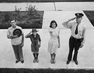 Here's the approved salute to be given when the pledge of allegiance is taken, as demonstrated by an ordinary citizen, Boy Scout, school girl and uniformed officer. Left to right, Arwin Blanke, 1125 Hawthorne Street; Jerry Trimble, 12, of Troop No. 104, son of Mr. and Mrs. Ross Trimble, 704 West Central Avenue; Janie Reynolds, 13, daughter of Mrs. Lucile Reynolds, 1020 Alston Avenue; and police Sergeant Joe Rice, 313 Blandin Street. All are shown saluting an American Flag outside. The scout clasps thumb and little finger in the palm of his hand. Except for the girl, the salutes given here also are to be bestowed on the flag alone. However, it is also proper for the adult civilian to extend his hand, palm upward, when the pledge is given. Civilians stand erect with right hand over heart, extending the hand at the words, "to the flag." Published in Fort Worth Star-Telegram evening edition July 3, 1940.