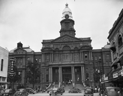 The Tarrant County Court House on Weatherford and Main Street. The building has three columns of stairs going towards the front doors. There are people standing outside. There is a "Union Bank and Trust Co." sign, cars in the street, and shops across the street from the Union Bank.