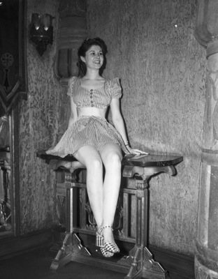 Mary Margaret McCarthy, 19, who will participate in a beauty contest on the Worth Theater stage. The contest is being held to select Fort Worth, Texas', entry in a beauty revue at the annual Texas Health Festival in Mineral Wells, Texas. The Junior Chamber of Commerce will sponsor the Fort Worth, Texas, winner. She is sitting on a table, wearing a striped blouse, a striped skirt and high heels.