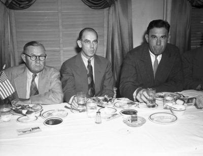 A preview of the 1941 National Open golf tournament was presented to members of the Fort Worth Advertising Club at their luncheon by, left to right, Doctor Alden Coffey, president of the Fort Worth Golf Association, Marvin Leonard, creator of Colonial Club, where the meet will be held, and J. A. Gooch, vice president of the golf association. The three men are sitting at a dining table, all wearing suits. Coffey and Leonard are wearing eyeglasses. On the table are several plates, glasses and silverware.