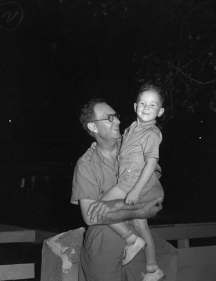Lake; Worth Casino Boardwalk cave-in. Milton Marks and his son, Max. Photograph of man holding his young son in his arms. Both are smiling. They were fortunate to survive when the boardwalk caved in. Fort Worth Star-Telegram Evening Edition 1940-07-05.