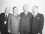 Attendees and speakers at the joint annual meeting of the Texas Dairy Products Association and the Texas Division, American Dairy Association at Hotel Texas. Left to right, they are Harvey T. Smith, president of the two associations; A. J. Riddle, chairman of the quality committee of the National Cheese Institute of Kansas City, Missouri; C. N. Shepardson, dean of agriculture at Texas Agricultural and Mechanical College; and Grant J. Johnson, of Fort Worth, Texas, who was the first president of the Texas Dairy Products Association in 1936. All four men are standing against a bare wall, wearing suits.