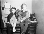 Tommy Eugene and Mary Elizabeth Eustace, children of Mr. and Mrs. L. E. Eustace, shown with their red cocker spaniel, Eustace's Red Contender, they will exhibit at the Lone Star Cocker Specialty Club's show at the Recreation Building. They are sitting on the table, the dog is standing between them. Published in Fort Worth Star-Telegram morning edition, February 21, 1946.