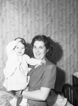 Mary Diana Rosalie Wild Harrison and daughter Joanne Johnson. Wife and daughter, respectively, of Curtis Guy Johnson, Staff Sergeant in the Army Air Forces stationed in England. Staff Sergeant Johnson of non-battle related injuries. Mrs. Johnson and Joanne moved to Texas upon the request of Staff Sergeant Johnson. Mrs. Johnson and Joanne are sitting on a bed. Both are wearing dresses. Joanne is also wearing a sweater. The wall behind them is papered in a flower print.