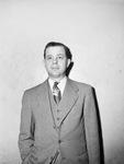 Lewis C. Montgomery, 33, overseas veteran and an former employee of Monnig Dry Goods Company, has announced his entry into real estate business. He is a native of Mount Pleasant, Texas, where he graduated from high school. He attended the University of Texas. He lived in Fort Worth, Texas, for several years before he was inducted into the Army. Montgomery served 14 months in the China-Burma-India Theater as a first lieutenant in the Army Air Forces and was discharged last September. He is standing against a bare wall, wearing a suit.