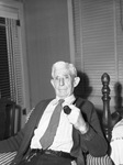 James Lafayette Cross, Brown County pioneer, sitting in a comfortable chair, wearing a sweater and holding his pipe. He is 89 years old and is one of the oldest pioneer of the section. He's believed to be oldest active Mason in the county.