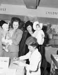 Among the rush of early registrants in Camp Bowie Post, Veterans of Foreign Wars, Better Baby show at Leonard's infant department were, standing, left to right, Mrs. W. J. Smelley Junior with her 3 month old son, W. J. Smelley III; Mrs. B. H. Blankenship and daughter, 2 -year-old Billie Sharon. Seated is Mrs. Ruby Sones, Veterans of Foreign Wars auxiliary president. Published in the Fort Worth Star-Telegram evening edition, February 20, 1946.