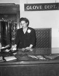 Mrs. Roy E. White, wearing camellia on her blouse. Mrs. White wears a fresh camellia to her work every day and credits her husband for making it possible. She is shown standing behind a store display table. Under the glass of the table there are different items, such as an umbrella and a hat. Mrs. White rests her hands on the tabletop with a couple of flowers laid out. She looks on at them. Behind her is a doorway that leads into a room that has many umbrellas stored. Above her a sign that reads, "Glove Dept." hangs.