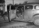 The car in which Joe Hinton, 43, was riding when he crashed into a Riverside neighborhood home after a gun duel in the neighborhood with C. L. Griffin, 71. Mr. Hinton was in critical condition after the shooting and accident. The driver side door is ope.