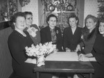 The Polytechnic Garden Club is meeting to discuss plans for the citywide Flower Festival from May 10-12, 1946. Members, left to right, are Mrs. A. J. Reinhard, Mrs. J. E. Burt, Mrs. R. C. Bell, Mrs. T. J. Clark, Mrs. Harry Duncan, and Mrs. Louis Bothe. Mrs. Bell is chairman of the committee. The women are shown sitting around a table, making notes on a piece of paper.