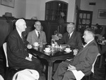 Politics and breakfast were mixed at the Blackstone Hotel before the meeting of the State Democratic Executive Committee was called to order by Harry L. Seay, left, Dallas, Texas, state chairman; others in the picture are, left to right, R. F. Peden, Houston, Texas, whose report on party voters and candidates was expected to settle the issue of whether Texas Regulars may participate; Nat H. Davis, committee member from Conroe, Texas and Cecil Lotief, Rotan, Texas, former member of the committee and a former legislator. They are all sitting at the square dining table and eating breakfast. Published in the Fort Worth Star-Telegram evening edition, February 22, 1946.