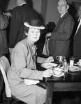 Democratic executive committee is having breakfast at the Blackstone Hotel coffee shop. It has been some time since the executive committee held a meeting here. Fort Worth won over Austin for the meeting. In this picture is Mrs. Ross Woodall, Huntsville, Texas, publisher of the Huntsville Item and publicity director for the committee. Mrs. Woodall claims her paper is the oldest weekly in Texas and pointed with pride to the fact it will celebrate it's 100th birthday in 1950, not far behind Texas statehood. She is serving her third term on the committee. She is sitting at a dining table and posing for a picture. Published in the Fort Worth Star-Telegram evening edition, February 22, 1946.