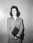 If those professional offers may be used as a criterion, Fort Worth's Jo Kennedy must be one of the best women softball pitchers in these parts. Good as she is, though, Jo can't go on forever. The most likely candidate to succeed Kennedy , when her blazing fast ball begins to lose its smoke, is Elsie Shannon. Elsie is making rapid strides. Last season, she divided time on the mound with Kennedy for Globe's jam-up aggregation. The records show that in 1945 they each won some 26 games and each lost four. All Globe players except Pitchers Kennedy and Shannon will wear the blue and fuchsia uniforms. The pitchers pretend to make it easier for the hitters by wearing black uniforms. In this picture, Shannon is standing against the wall and facing slightly left. Published in the Fort Worth Star-Telegram morning edition, February 23, 1946.
