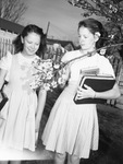 Martha Bowers and her sister Patsy Bowers examine an almond tree branch laden with flowers. They are the daughters of Mr. and Mrs. C. E. Bowers of 2013 Lee Avenue, Fort Worth, Texas. The almond tree grows in the family's back yard. Martha is wearing a jumper and a shirt. Patsy is holding school books and a notebook in her left hand while holding the tree branch with her right. She is wearing a skirt and blouse and also a necklace. Behind them is a picket fence. This photograph appeared in the February 21, 1946 morning edition of the Fort Worth Star-Telegram.