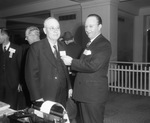 A meeting attendee puts a name tag on A. C Alexander, vice president of the Snyder National Bank.