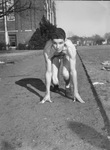 Track meet. Billy Scott, Paschal. A boy shirtless on the track field in running position.