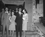 Mr. and Mrs. Merle Gibson, left, and Mr. and Mrs. Norman Cox. The happy couples, in front of the church entrance, had a double wedding ceremony at the University Christian Church. All from Texas Christian University, the bridegrooms were classmates and football stars together and the bides were classmates.
