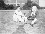 Sports. Carroll Baird, left and Coach C. W. Berry. A man and a boy sitting by each other in a field of grass.