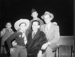 Johnny Camera, Italian stowaway war orphan for who former 36th Division buddies squared off with immigration authorities in order to get him to Texas, is shown, extreme left, immediately after his arrival in Waxahachie. Next to him is Claren Thompson, bachelor cafe owner and former mess sergeant, who wants to adopt him. They met in Waxahachie for the first time in almost two year. They shared quarters and perils together for 11 months at Salerno, the Rapido River and other tough spots. On the extreme right is Roy Thompson, Curly's brother and another 36th Division vet who was with Johnny in Italy. In the background is Private R. M. Thompson, another brother, who saw service in Europe with the 36th Division and is now at McCloskey General Hospital. Published in the Fort Worth Star-Telegram morning edition, February 23, 1946.