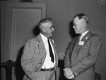 Oil officials John J. O'Hern, Laredo, Texas (left) and Joe Morris, San Antonio, Texas (right) are visiting Fort Worth, Texas. The Two men are wearing suits with name tags and glasses. Mr. Morris has his hands folded. The men are having a conversation. Star-Telegram Morning Edition November 11, 1945