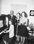 First Presbyterian Church, Arlington. Pastor and family. Reverend Charles L. Dickey, Mrs. Dickey and Dena Dickey, 13, with the ukulele. Seated at the piano is Margaret Dickey. Photograph of a man, a woman, a 13 year old girl, and a younger girl gathered around a piano. The 13 year old girl is playing a ukulele. The younger girl is sitting on a bench playing the piano. There is sheet music on the piano.