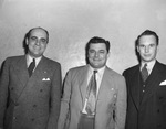 Left to right: Carson W. Davis, Russel Brickell, and Bob Baskin. The three men are standing in front of an empty wall, smiling widely and wearing suits. Both Davis' and Baskin's suits are double-breasted while Brickwell's suit is single breasted and unbuttoned.