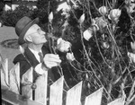 Doctor M. Smith examining magnolia blossom in his garden at home, 2017 Carlton. The six-inch blossoms are on a 10-foot magnolia stellate. Good drainage rather than rich soil is the prime factor for successful cultivation of the tree. published in the Fort Wort Star-Telegram evening edition, March 1, 1946.