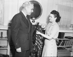 Mrs. J. Elmer Cox is shown helping her husband select a tie to wear to the 12th annual Bosses' Banquet of Beta Alpha Tho, Young Women's Christian Association (YWCA) business girls' club, Tuesday night at the Woman's Club, Cox will go as the guest of his secretary, Mrs. Ray Stokes. The Coxes live at 3724 Avenue K. Mrs. Cox is shown picking a tie up from various ties laid across Mr. Cox's arm. Mr. Cox is looking at his wife and smiling. Behind the couple are shelves with books and a photograph. A round mirror is mounted on the wall. Star-Telegram Morning Edition February 26, 1946