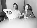 Clipping photograph caption: Olga Lou Caraway, left, won the first prize of of a $100 Victory Bond and Eddie Nunn, right, won the third prize of a $25 bond in Northern Texas Regional Scholastic Art Contest. Both are Paschal High School students. Photograph of two high school students, one male and one female. They are sitting at a table smiling. The male student is on the left and is holding an art sketch. The female is on the right and is holding a small decorative sculpture.