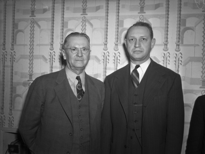 The Texas Oklahoma Shoe Retailers Association is holding a convention at the Hotel Texas. More than 240 lines are being shown. In attendance left to right are W. T. Mitchell and A. E. Allen. Mr. Mitchell, of San Antonio, Texas, is the new secretary-treasurer. He is wearing a three piece suit. Mr. Allen, of Dallas, Texas, is the vice president of the Association. He is dressed in a three piece pinstripe suit.