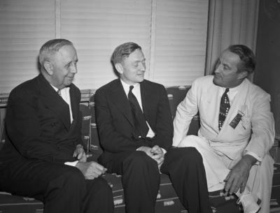 Attending the 59th and last annual meeting of the Texas Bar Association at the Blackstone Hotel are, left to right, Charles A. Beardsley, of Oakland, California, William O. Douglas, of the United States Supreme Court, and Angus G. Wynne, of Longview, Texas, retiring president of the association. After this meeting, the State Bar of Texas will replace the old association. The three men are sitting on a couch, all wearing suits.